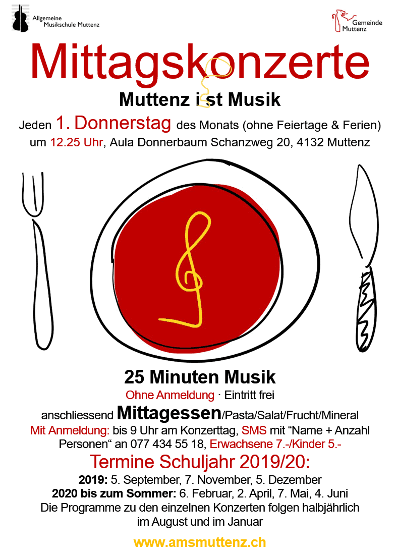 Die Mittagskonzerte mit musikalischen Leckerbissen für Muttenz. Die Konzerte richten sich an Alle – Kinder, Jugendliche und Erwachsene (2-117 Jahren). Sie finden neu jeden 1. Donnerstag des Monats über Mittag (exklusiv Feiertage und Schulferien) in der Aula Donnerbaum statt und sind gratis. Anschliessend an die Konzerte wird vor Ort, gegen einen kleinen Unkostenbeitrag, ein einfaches Mittagessen angeboten. Die Mittagskonzerte bieten vielfältige Musikprogramme, frisch interpretiert und gepackt in einen halbstündigen Zeitrahmen: Kurz und knackig – für Klein und Gross – einmal im Monat. Es spielen Profimusiker/innen, unsere AMS Musiklehrpersonen und besondere Ensembles aus Muttenz. Die Kinder und Jugendlichen lernen verschiedenste Musik, das aktive Zuhören und das Besuchen von Konzerten kennen. Die Erwachsenen müssen einmal im Monat nicht in die Küche stehen und dürfen als Belohnung im Konzertsaal sitzend Musik geniessen.